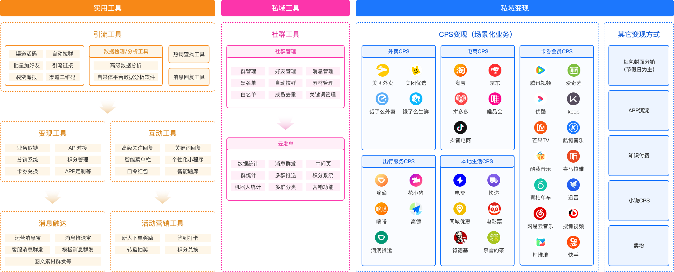 为用户提供多场景营销工具产品、提高推广效率、实现高效变现。