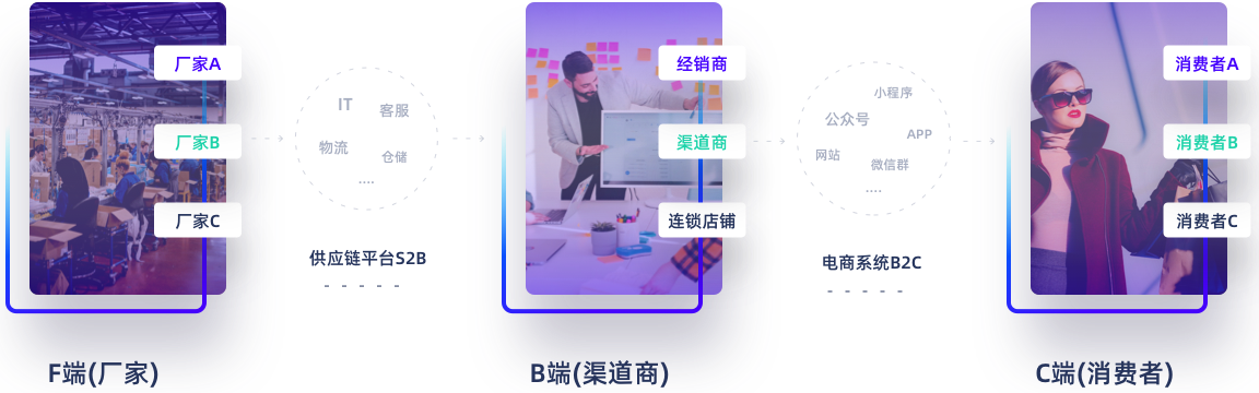 供应链电商是将F端(厂家)商品整合到S端(供应链平台)为B端 (经销商,商场平台)提供厂家一手货源,销售到C端(消费者) 不同于传统的B2C模式,商家无需自己准备货源,不需要 盘点仓库库存。不需要搭建好平台接入供应链,供应链就 可以提供海量货源,商家既可以为消费者提供大量的优质 低价商品,全程无货源,无售后,一键操作。为当前电商 提供新模式新玩法。